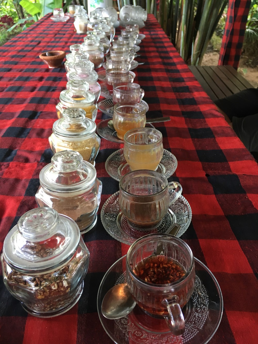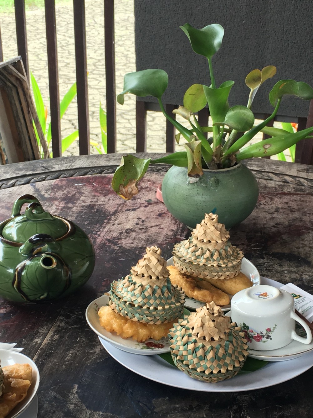 My class was in a very idyllic countryside location. They served us tea with cinammon sticks (as a stirrer) and palm sugar syrup and banana fritters with funny little hats.
