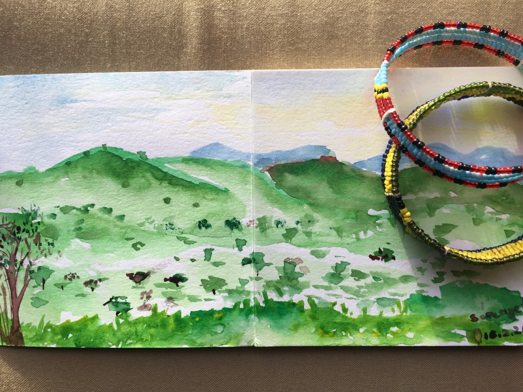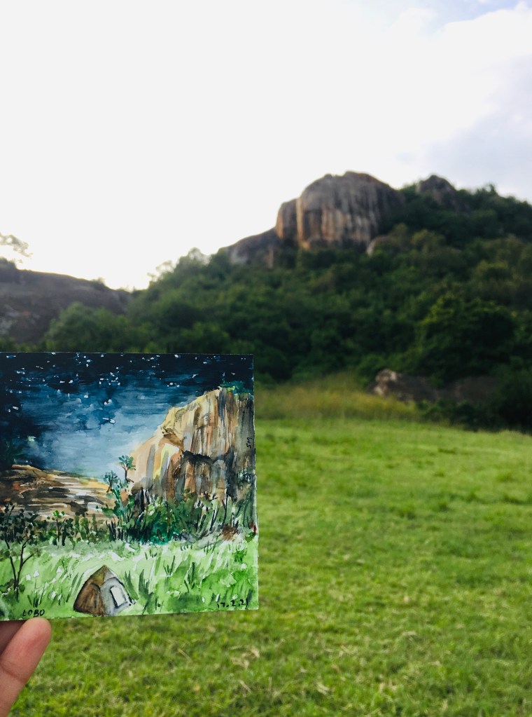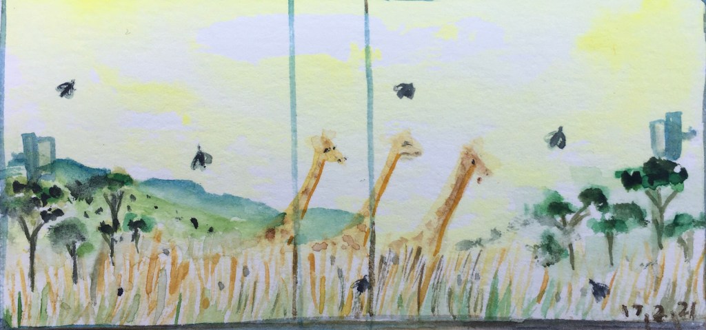 We were so busy swatting these uggos that we couldn’t take a picture of long neck bunnies walking in the distance their golden necks shining in the sunlight. So here is a painting instead.