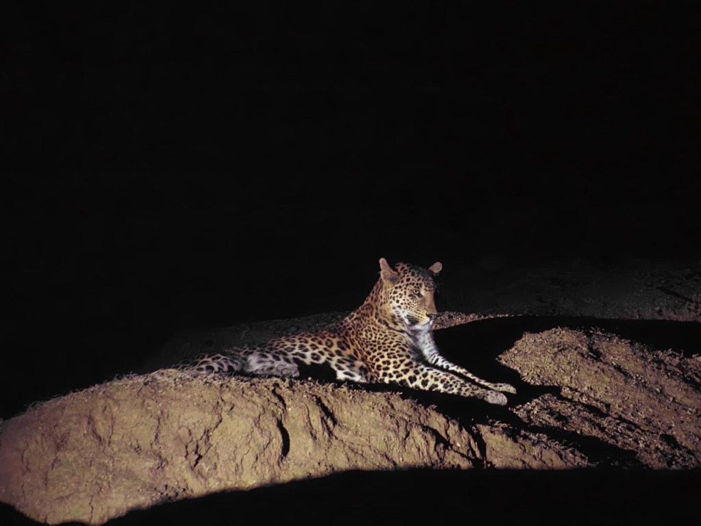 That evening we went on a night safari and spotted a baby leopard in the very first hour. We also spotted an almost dead bull flicking its ears nearby. This meant it was a fresh kill and that the leopard mum was nearby. And lo behold, she was, with one more baby!