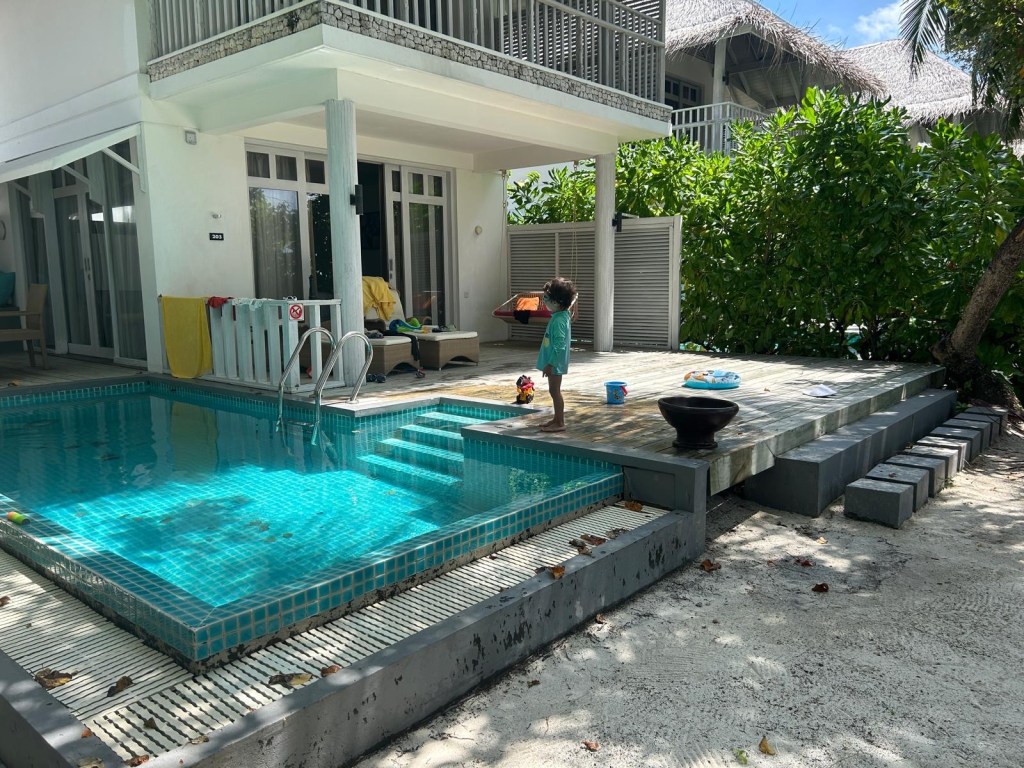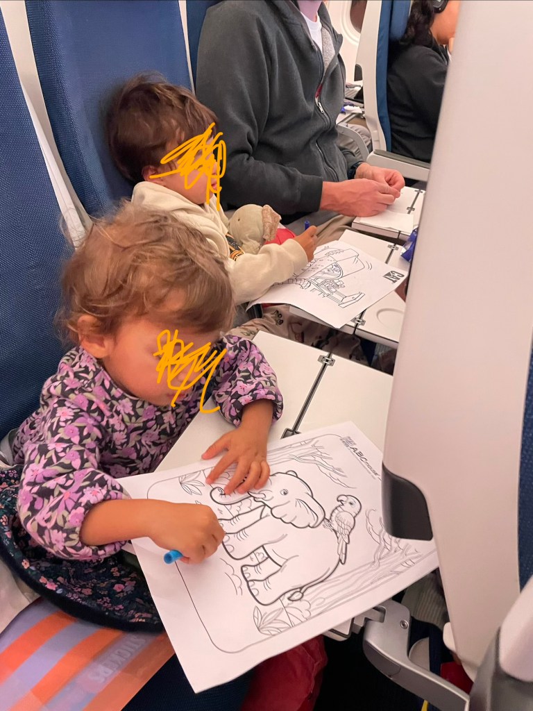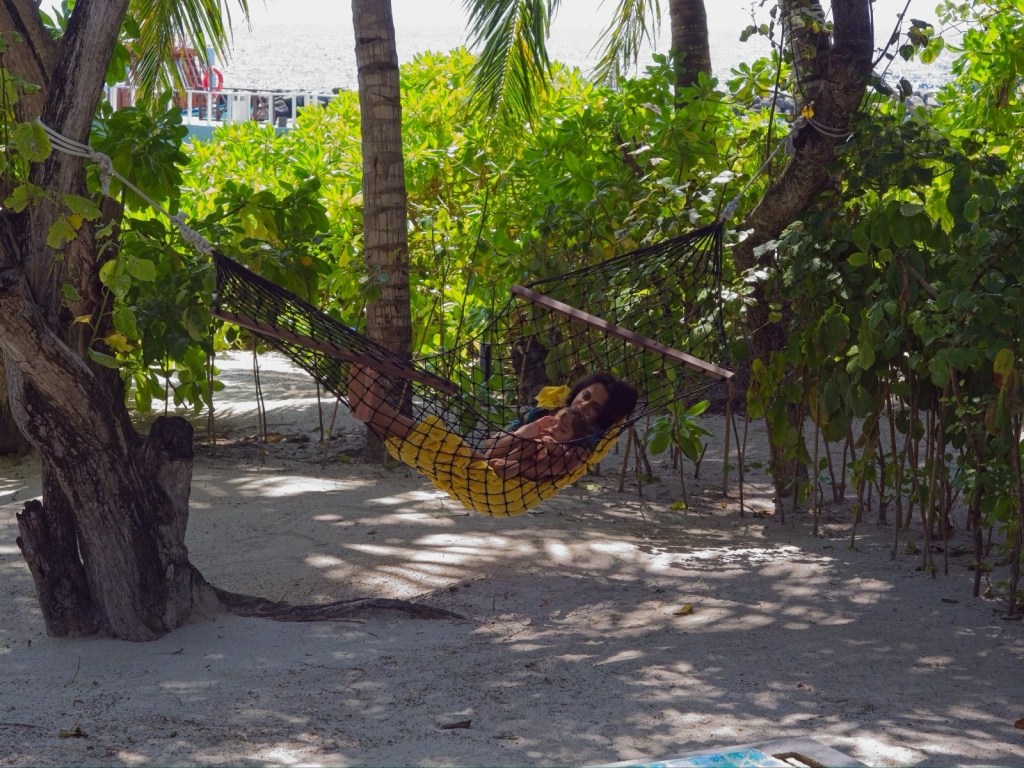 We took a direct 10.5 hour flight from Zurich to Male. I had heart palpitations about flying this long with the two baby bunny monsters, but with approx. 30 sec of colouring, 1 ish hour of videos (altogether), 5 ish hours of sleeping, and only a few hours of existential discomfort, we survived!