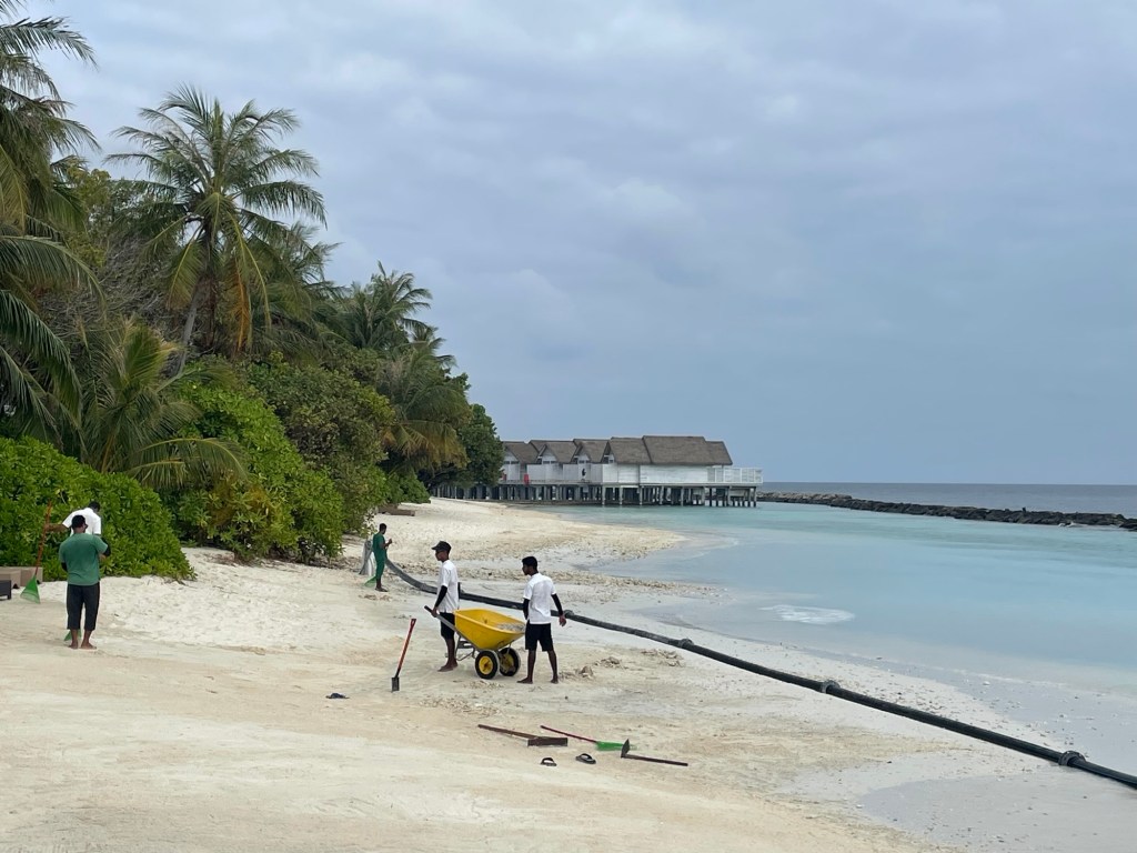 The islands needs to be protected from the sea, the guests need a lagoon to get their pictures in large flamingo floats, they need nice beaches with creamy white sand without a trace of stone/ broken coral – so a wall needs to be built around the islands, often at the expense of the natural reef, breaking coral on the way.